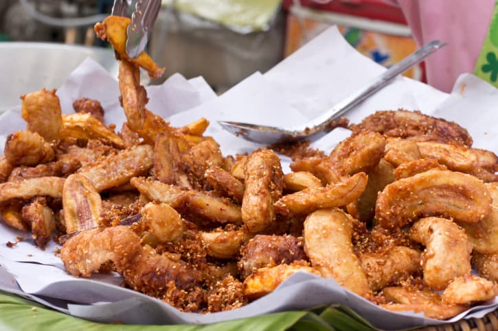 Calienta el aceite en una sartén y coloca suavemente los trozos de plátano dentro, cuidando que no salpique. Cocina 5-7 minutos de cada lado a fuego medio. Cuando esté cocido del todo, flotará levemente. Deja reposar los plátanos en papel absorbente y espolvorea sal o azúcar (a gusto) antes de servir.