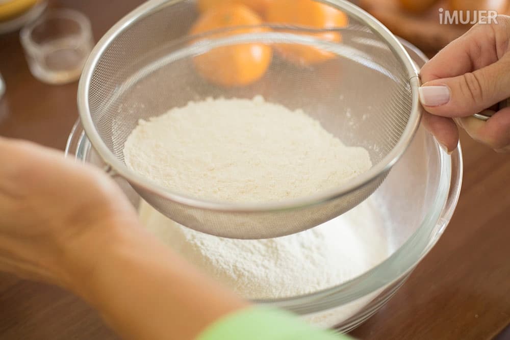 Tamiza la harina, el almidón de maíz, el polvo para hornear y la sal en un bol.