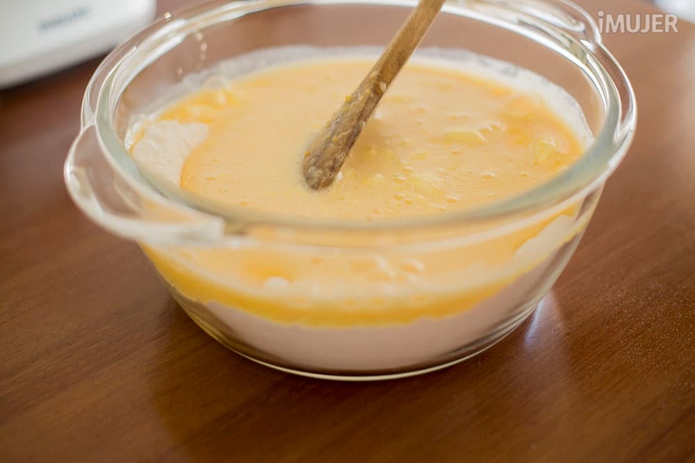 Incorpora el aceite, los huevos y el azúcar, y licua nuevamente.