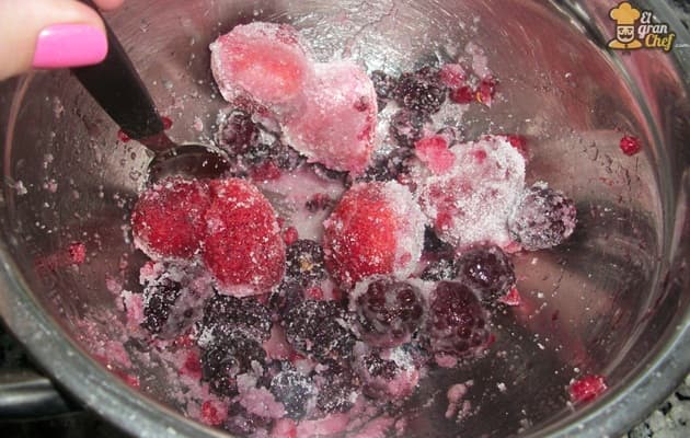 Si los frutos rojos a utilizar están congelados, comenzamos por agregar a los frutos jugo de un limón (aproximadamente) y azúcar común.