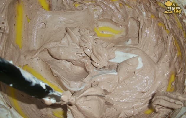 Separamos la crema en dos bols. La idea es que una parte se utilice asi como está como crema chantilly. Y en el otro caso, elaboramos una mousse rápida de chocolate, que se formará instantaneamente, sin mucha elaboración.