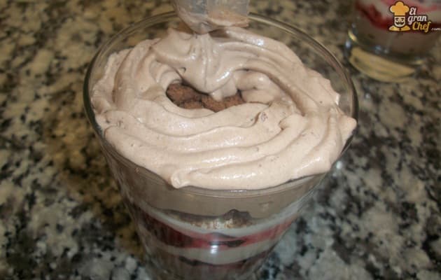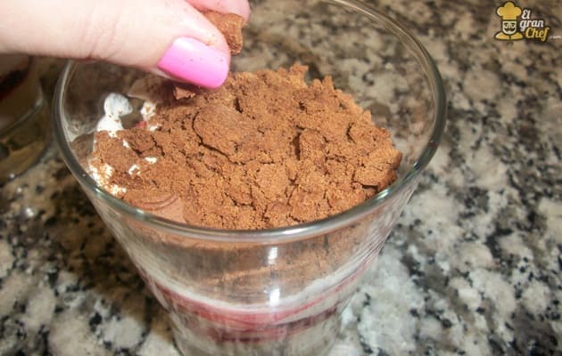 Y comenzamos de nuevo repitiendo el proceso y siguiendo el órden de colocar: crema de chocolate - frutos rojos - crema blanca - frutos rojos, con la diferencia que intercalamos cuando querramos a las galletitas molidas.