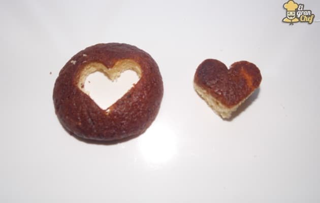 Con un cortante de corazón, corta la tapa de los muffins, reservando la tapa y el corazón.