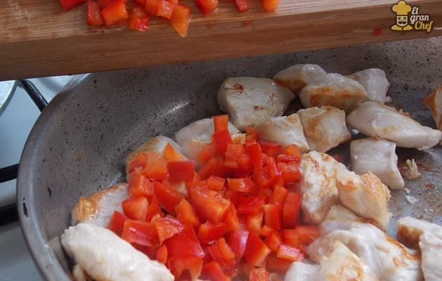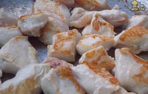 Colocar aceite en una sartén a fuego fuerte y colocar los dados de pollo hasta que se doren.
