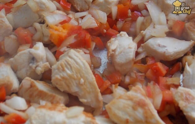 Una vez que el pollo se doró en todos sus lados, agregar el ají y la cebolla hasta que se rehoguen.