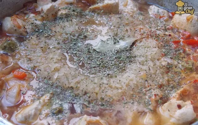 Colocar el arroz y las tazas de caldo -que puede ser del sabor que tú prefieras, verdura, pollo, carne- caliente. Agregar con ello todos los ingredientes: ají molido, laurel, orégano.