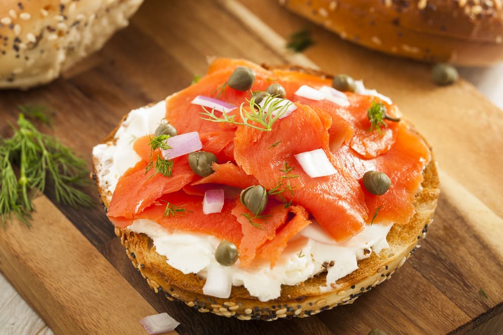 Toma dos rebanadas de pan de molde y llévalas al horno hasta tostar. Una vez estén prontas, úntales yogur griego y coloca encima unas lonchas de salmón ahumado. Decora con alcaparras y pimienta negra.