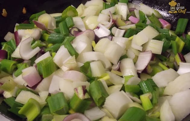 Cortamos la cebolla de verdeo en pequeños bastones.