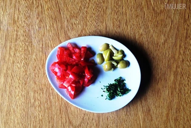 Lavar el tomate y cortarlo en cubos del mismo tamaño que la palta. Cortar por otro lado las aceitunas en finas láminas, y tirar el carozo. Lavar el cilantro, quitarle los tallos y picarlo bien chiquito.