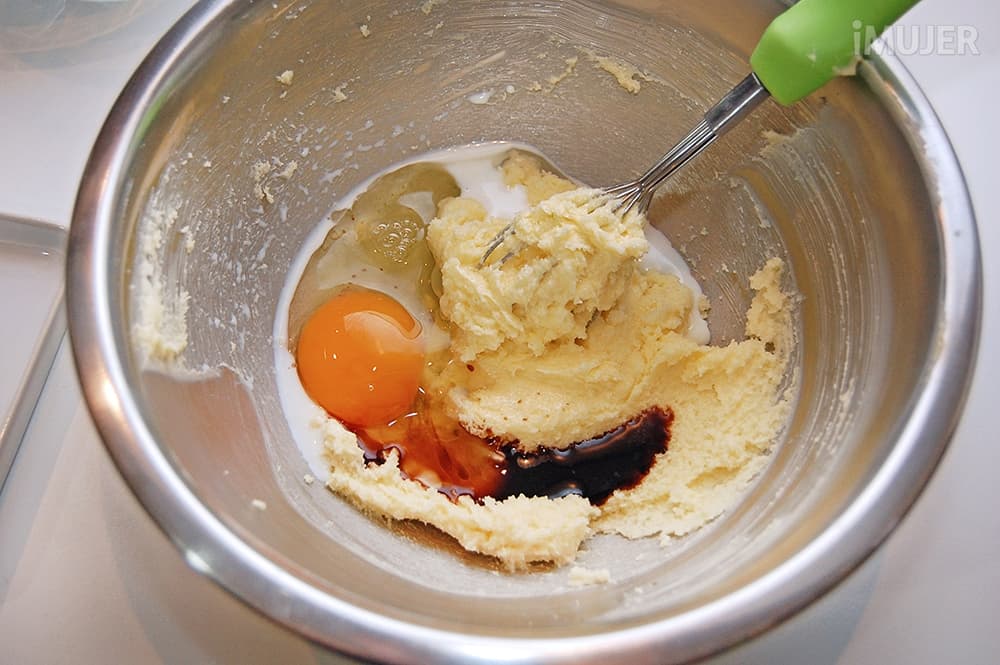 Cuando están todos los ingredientes combinados incorpora en dos veces los ingredientes secos, harina, polvo de hornear y sal.