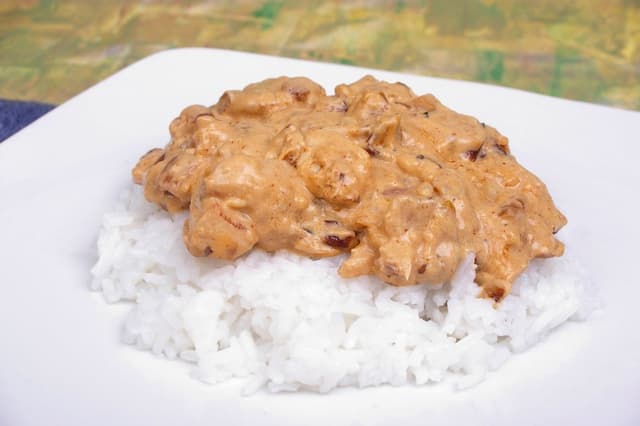El arroz es un acompañamiento perfecto para el pollo con salsa de champiñones.