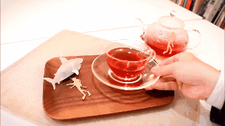 Tiene forma de tiburón, y en su otro extremo viene acompañado de un buzo, o un barco en caso del tiburón ballena. La compañía a creado este té en dos sabores: té verde de las profundidades y, el que nos trae al punto interesante, con sabor a rosa mosqueta e hibiscos, que cuando se sumerge en el agua crea algo increíble.