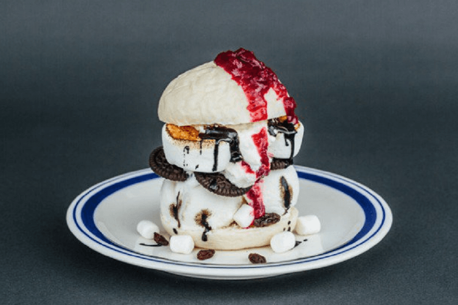 Y para no olvidar al fantasma que da popularidad al logo de "Los Cazafantasmas", la cadena creó una hamburguesa dulce cuyo relleno es de galletas Oreo y malvaviscos, pero que no deja de lado lo escalofriante y está bañada con un poco de “sangre”.