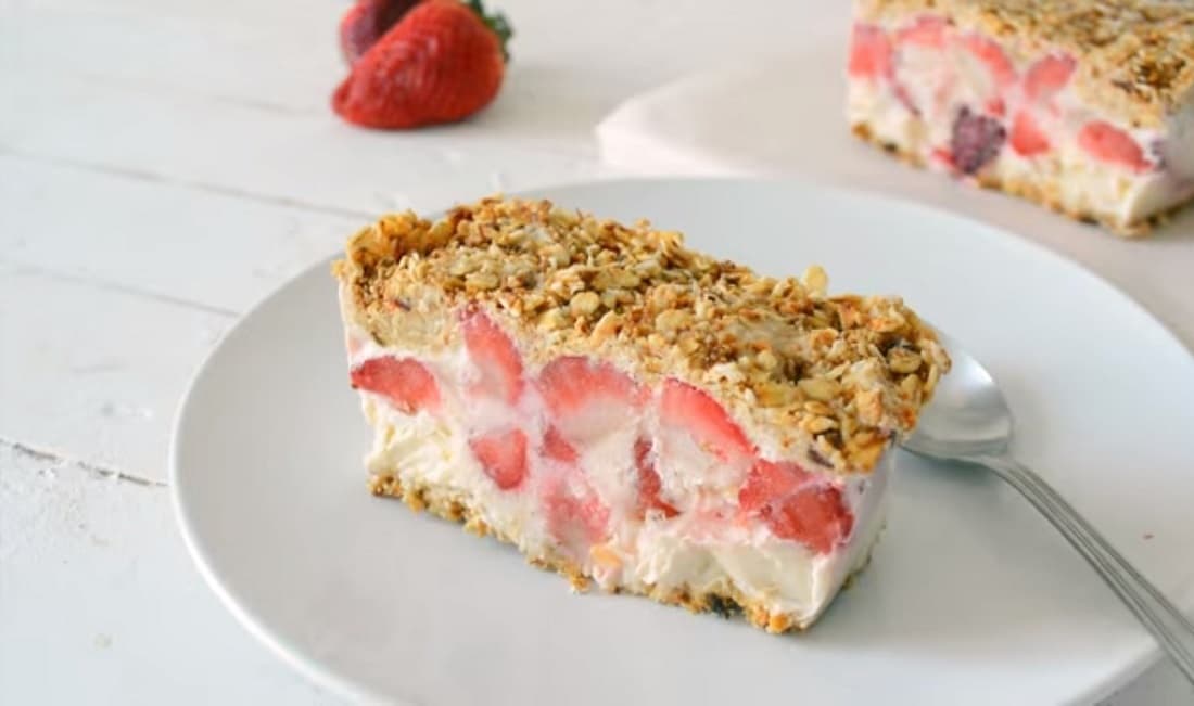 6. En un molde, coloca la mitad granola preparada (como base). Encima agrega la mezcla del yogurt y las fresas (picadas en rebanadas). Encima coloca el resto de la granola para cubrir.