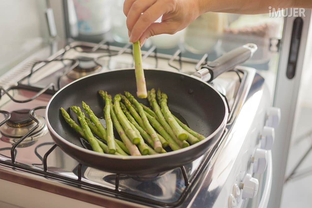 Vierte una cucharada de aceite de oliva en la sartén y pon a calentar. Saltea los espárragos y ponles sal a gusto.
