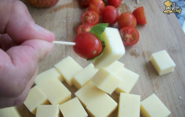 Pinchamos con escarbadientes el queso, una hojita de albahaca y el tomate cherry. Si el tamaño del tomate es muy grande se puede cortar a la mitad.