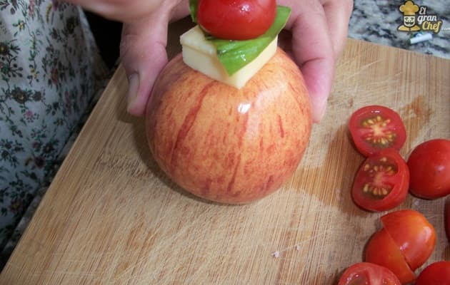 Tomamos una manzana, a la que le cortamos la base para que tenga un buen sostén. Comenzamos a llenar la manzana con los pinchos caprese, colocándolos uno al lado del otro hasta completar.