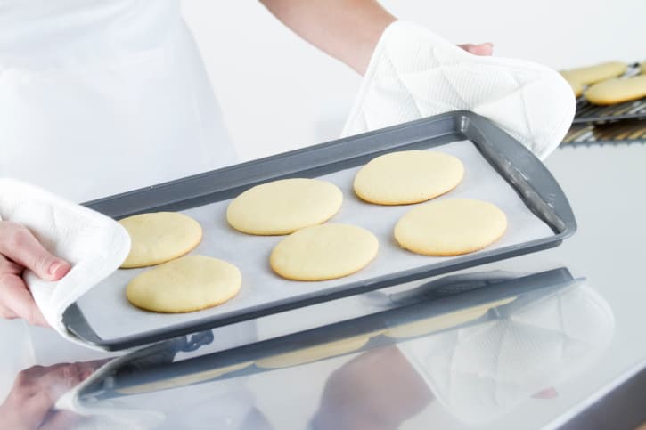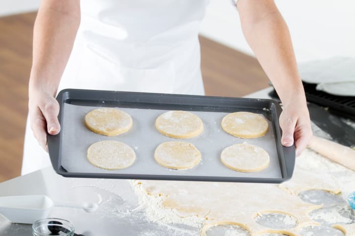 Coloca las galletas cortadas sobre una placa cubierta con papel manteca. El papel manteca te asegurará que no se van a pegar a la placa.