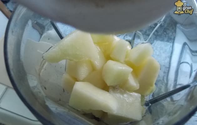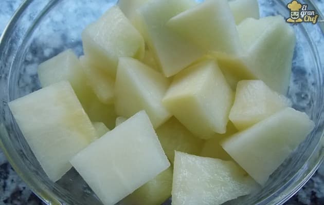 Sacar la cáscara al melón y cortar pequeños dados para facilitar el trabajo en la licuadora. Reservar.