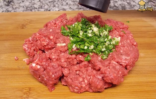 Tomamos la carne picada desgrasada y le agregamos el ajo y el perejil previamente picados.