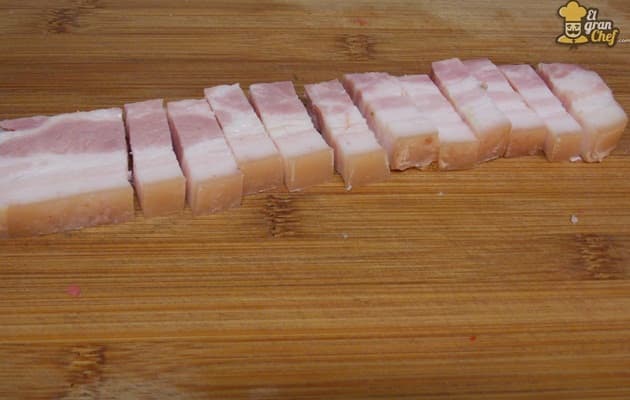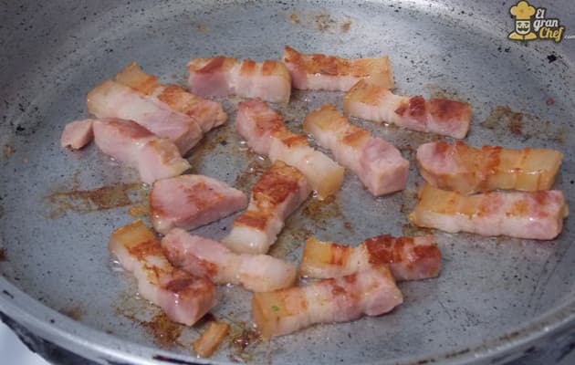 Ponemos a calentar una sartén y colocamos el tocino. Es importante que no se le agregue aceite en absoluto, ya que vamos a cocinar éste y el resto de la receta con la grasa que desprende. El tocino debe dorarse en su totalidad.