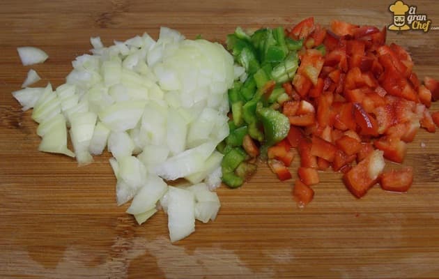Paralelamente, cortamos la cebolla y el ají morrón en pequeños cubos.