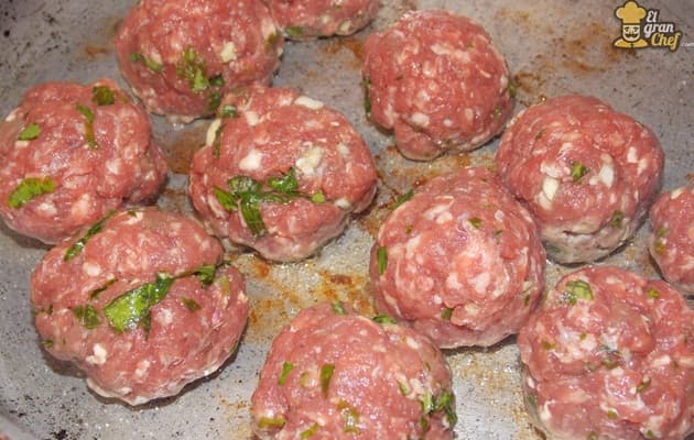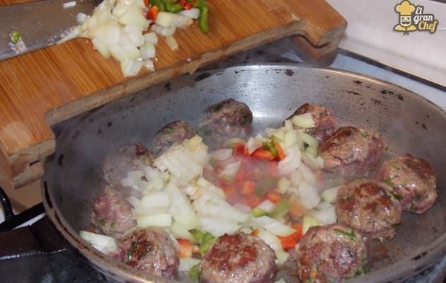 En la misma grasa que desprendió el tocino, colocamos las albóndigas y las cocinamos hasta que se doren por fuera.
