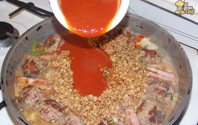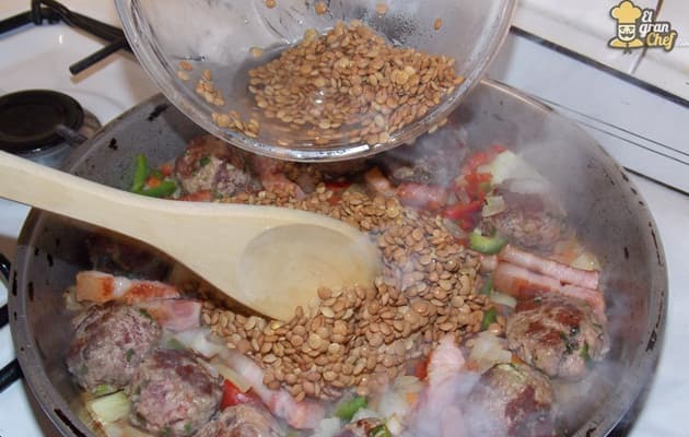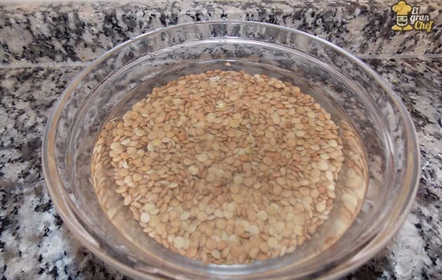 Agregamos las lentejas con un poco del agua que utilizamos para remojarlas.