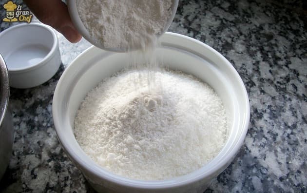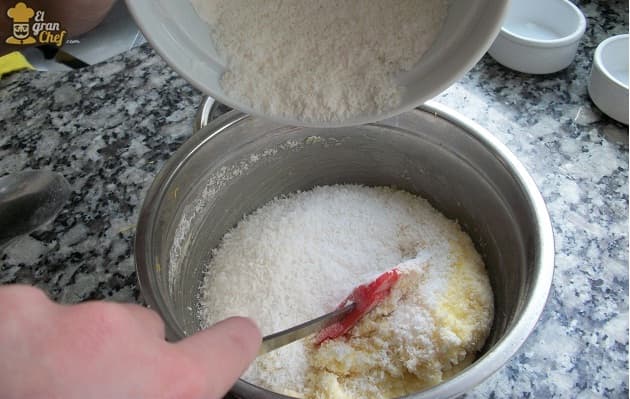 Mientras, en otro bol, mezclaremos el coco rallado con la harina. Lo reservamos.