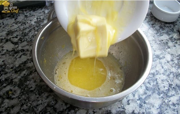 Como segundo paso, agregaremos la mantequilla blanda o derretida, para facilitar su incorporación. Puedes calentar la mantequilla en el microondas para hacer más rapido (30 segundos a mediana potencia aproximadamente).
