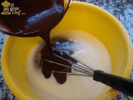 Batir los huevos con el azúcar hasta espumar bien. Agregar el chocolate derretido con la manteca y mezclar.