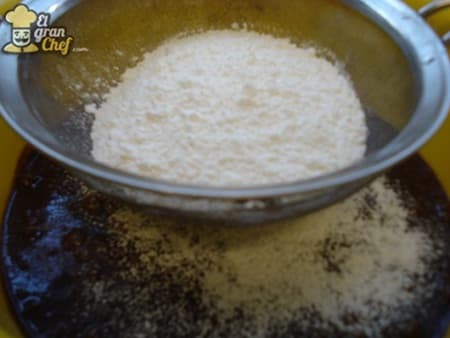 Incorporar a la preparación las harinas tamizadas. Si no tamizáramos la harina, probablemente la textura del brownie no sea tan suave y quizás nos encontremos con grumos dentro de la preparación (que encima al ser una preparación oscura, estos grumos se notarían más).