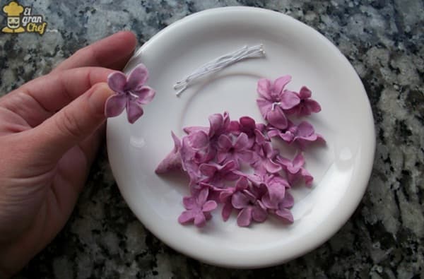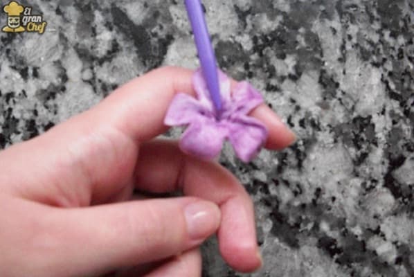 Una vez que tenemos los pétalos modelados, y la pasta aún esté fresca, tenemos que colocar los pistilos en el centro para simular el pólen de la flor. Si es necesario, cortaremos los pistilos para que no resulten tan grandes respecto del tamaño de la flor y evitar que queden desproporcionados.