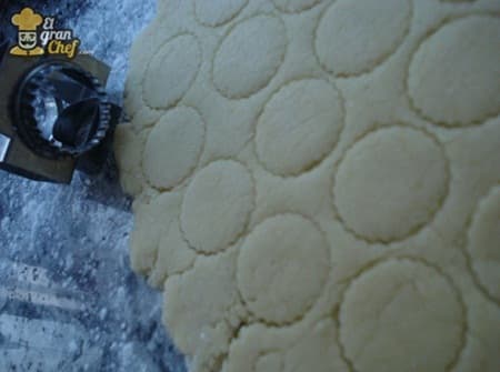 Yo utilicé un cortante circular rizado de 4 cm de diámetro pero puedes usar el que más te guste (¡hay muchas formas para elegir!) y disponer las piezas en una placa para horno. Dado que la masa contiene mucha materia grasa, no es necesario enmantecar la placa; las masitas no se pegarán.