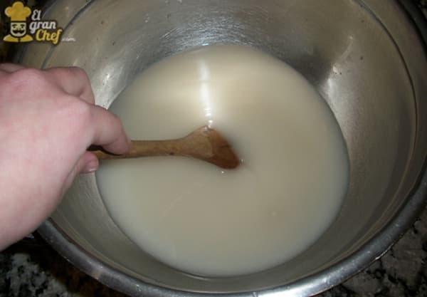 Por empezar, colocaremos en un bol, la levadura fresca desgranada con las manos y la disolvemos con el agua tibia. Revolvemos con una cuchara de madera hasta que no veamos trocitos de levadura.