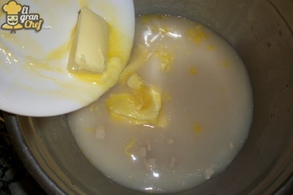 Luego agregamos extracto de malta, azúcar y manteca blanda. Seguimos mezclando con la cuchara.