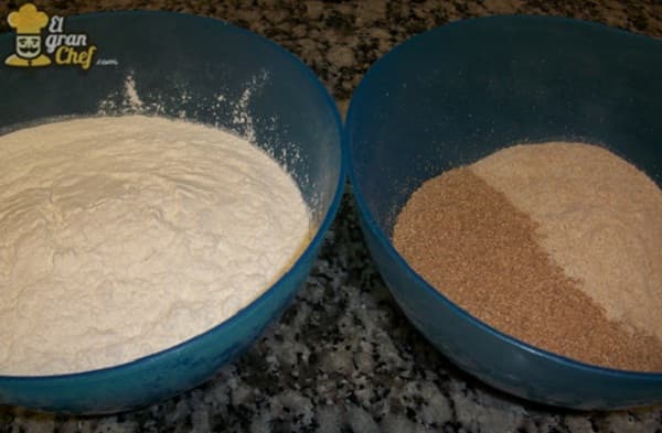 En otros bols, mediremos las harinas y el salvado . Por un lado, pesaremos la harina 0000 y a ésta le añadiremos la sal. En otro bol, colocaremos la harina integral y el salvado de trigo fino.