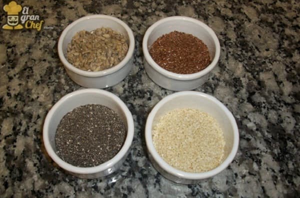 Mientras, prepararemos el mix de semillas que utilizaremos para la superficie del pan. He elegido sésamo, chía, girasol y lino. En el mercado hay muchas semillas para elegir. En algunos casos, viene un mix ya preparado. Si tienes una semilla preferida, puedes decorar los panes solo con un tipo de semillas.
