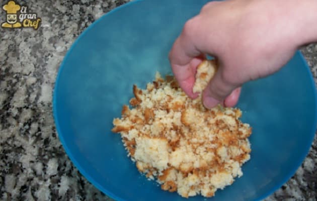 Comenzaremos desmenuzando las galletitas, bizcochuelo o lo que nos haya quedado. Se puede adelantar este paso colocando las sobras en la procesadora.