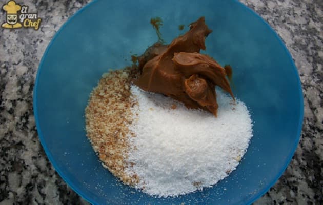 Luego añadiremos el coco rallado para aportar mayor sabor, esencia de vainilla, avena y dulce de leche para unir toda la preparación y que la consistencia nos permita realizar la forma deseada.