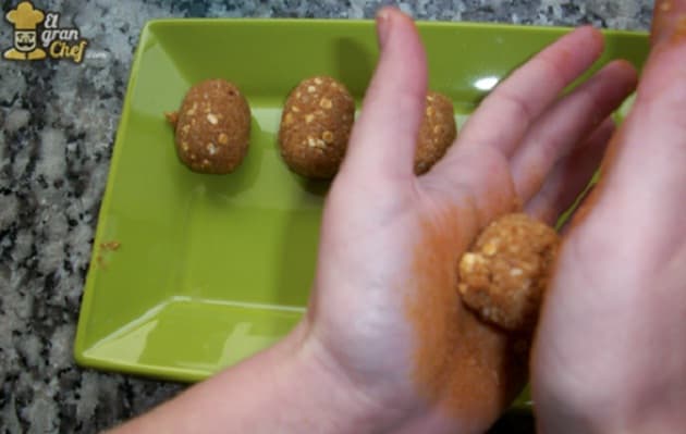 Después, cuando la pasta ya esté formada y la consistencia lo permita, tomaremos porciones pequeñas de masa y haremos bolitas con las palmas de las manos.