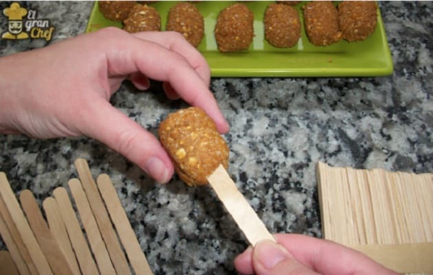 Después las retiramos y pinchamos las bolitas con palitos de helado o chupetín. Tratamos de hacerlo con cuidado, ejerciendo una leve presión para que las bolitas conserven su forma luego de introducido el palito.