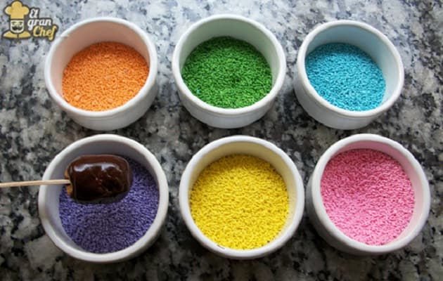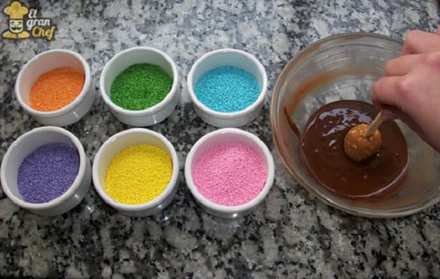 Para finalizar hacemos rodar los pop cakes por las granas elegidas. Hay cientos de colores y también podemos mezclarlas entre sí. Para que se sequen lo ideal es pinchar los palitos en un algún telgopor así se orean bien, sino debemos apoyarlos sobre algún platito con papel antiadherente encima para que se pegue a la base.