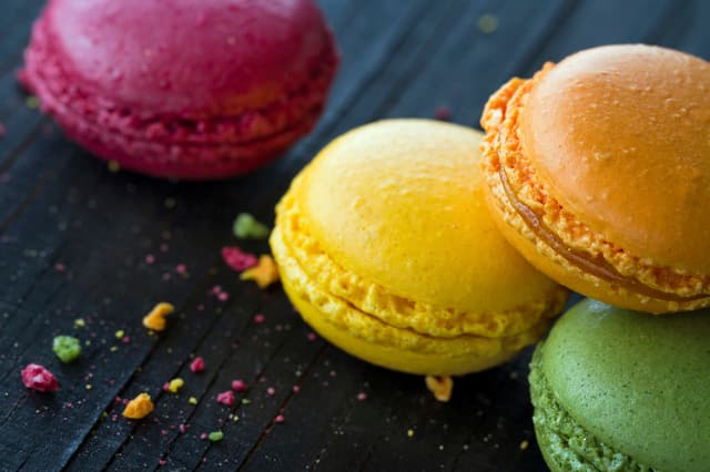 Estos coloridos y simpáticos bocaditos dulces hacen el postre perfecto para cualquier comida. Se elabora con clara de huevo, almendra molida, azúcar glas y azúcar. Estos postres se realizan en una amplia variedad de sabores según la época del año y la zona. Los macarons son particularmente conocidos por la gran gama de colores en la que se realizan.