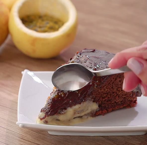 Pastel de chocolate con mousse de maracuyá