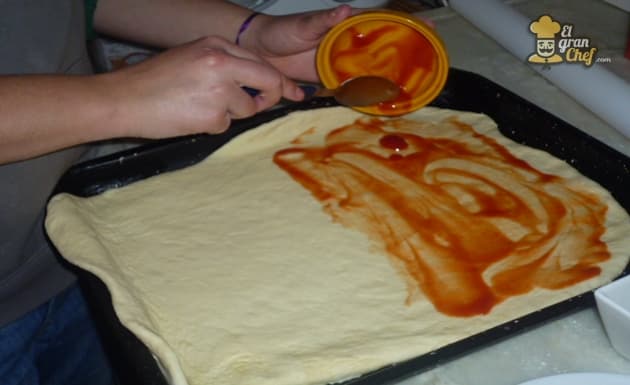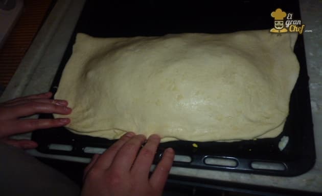 Colocamos un poco de aceite en una placa para horno y colocamos la masa.