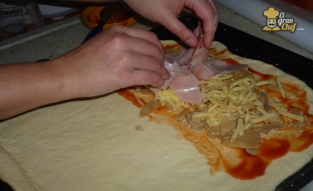 En la mitad de la masa pintamos con un poco de salsa de tomate (en este caso usé una que tenía en la heladera). Pueden ponerle o no, pero queda más gustoso. Y le vamos intercalando nuestro relleno.