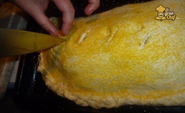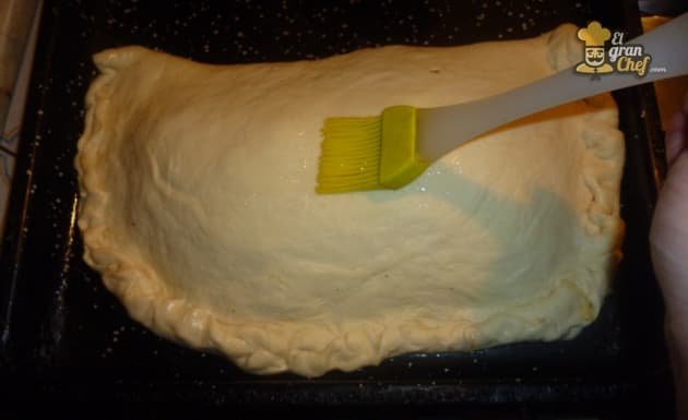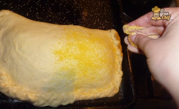 Pintamos con agua y aceite, espolvoreamos con harina de maíz y hacemos unos cortes para que respire el relleno.