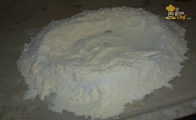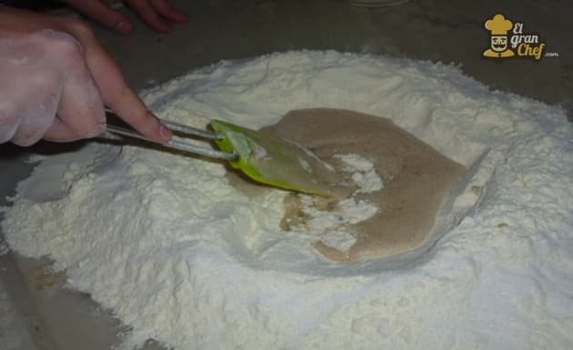 Hacemos una corona de harina en la mesada, agregamos sal por los bordes.