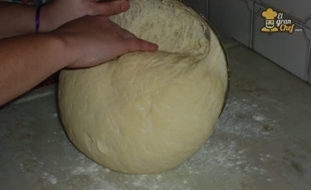 Una vez que doble su volumen, volcamos la masa sobre la mesada y desgasificamos presionándola con los dedos.